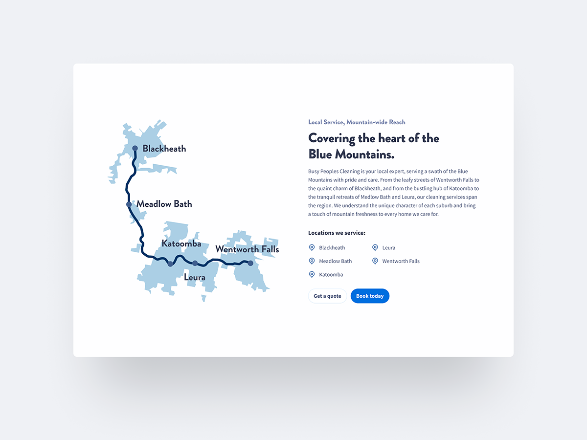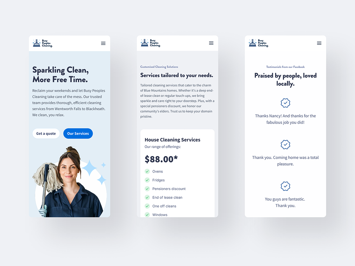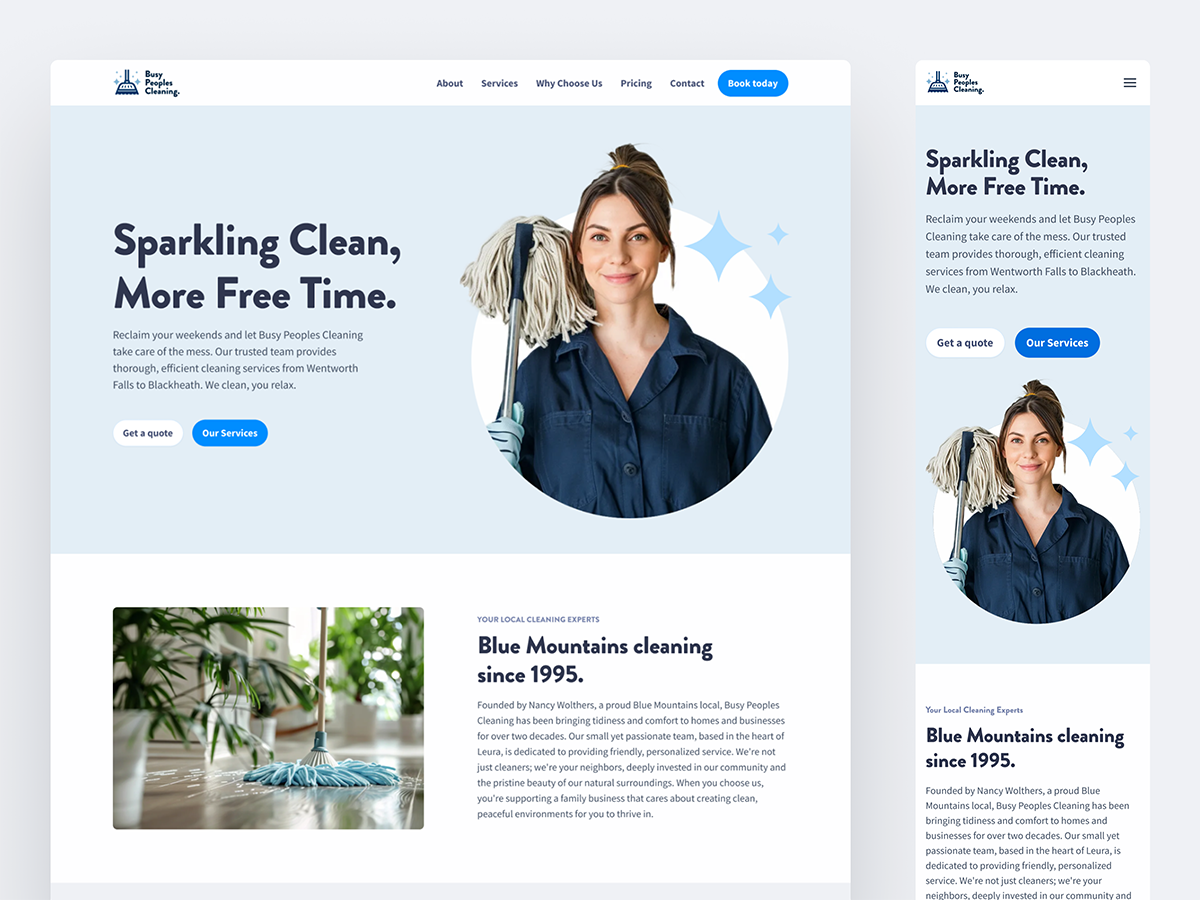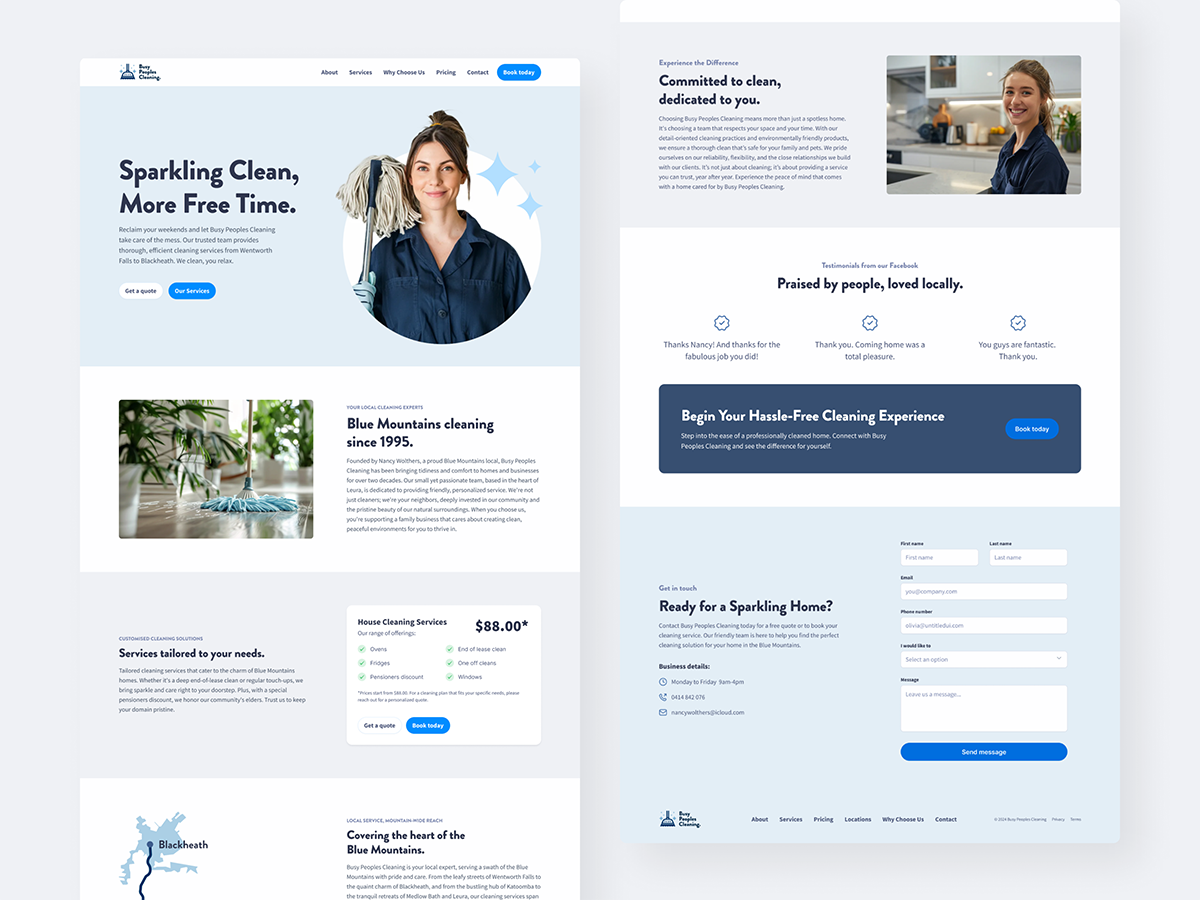 Busy Peoples Cleaning approached us for a simple, affordable website that would help them attract local customers and modernise their brand. We created a clean, friendly identity and a polished one-page website that communicates their services clearly and positions them well with Blue Mountains residents.