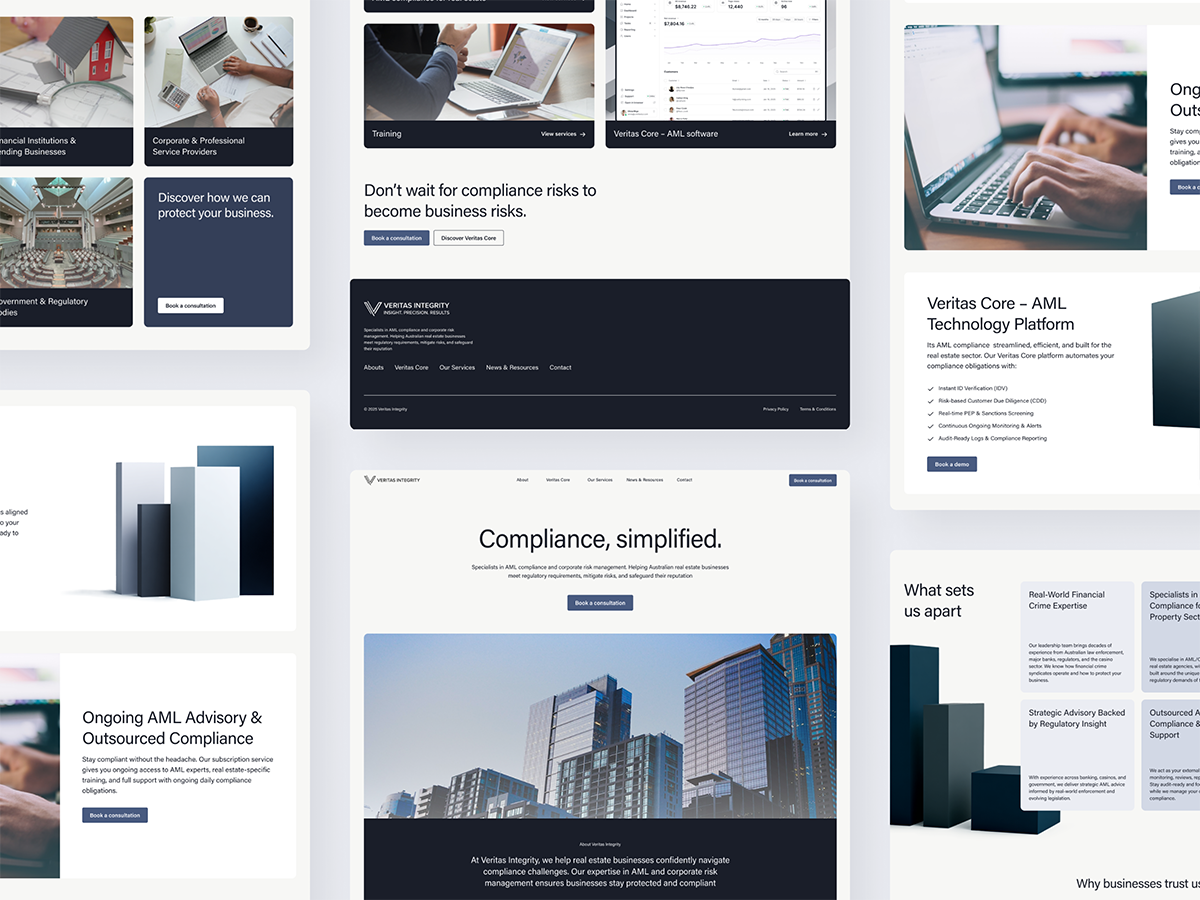 We designed the full UI for the public facing marketing site, creating a clear and credible digital presence for Veritas Integrity. The website focused on explaining their AML and KYC services, presenting their methodology with clarity, and establishing trust with regulated businesses. The design language is clean, professional and built to support future growth as the product ecosystem expanded.