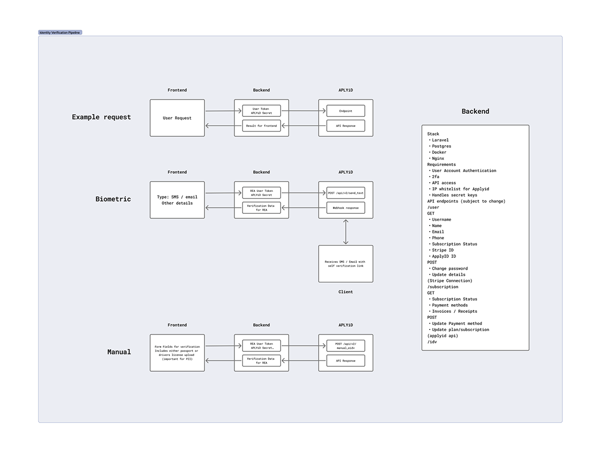 We produced a detailed technical outline for the IDV process that Veritas planned to deliver through Veritas Core. The architecture mapped how the system would interact with AplyID for biometric and manual verifications, how authentication and two factor verification should be handled, and how information would move between services. The design separated PII held by AplyID from metadata held by Veritas to support compliance and reduce risk. We also documented the responsibilities of each backend service including verification routing, subscription management through Stripe, API integration, and user role logic. This early stage architecture gave Veritas clarity on how the platform would function and expand over time.